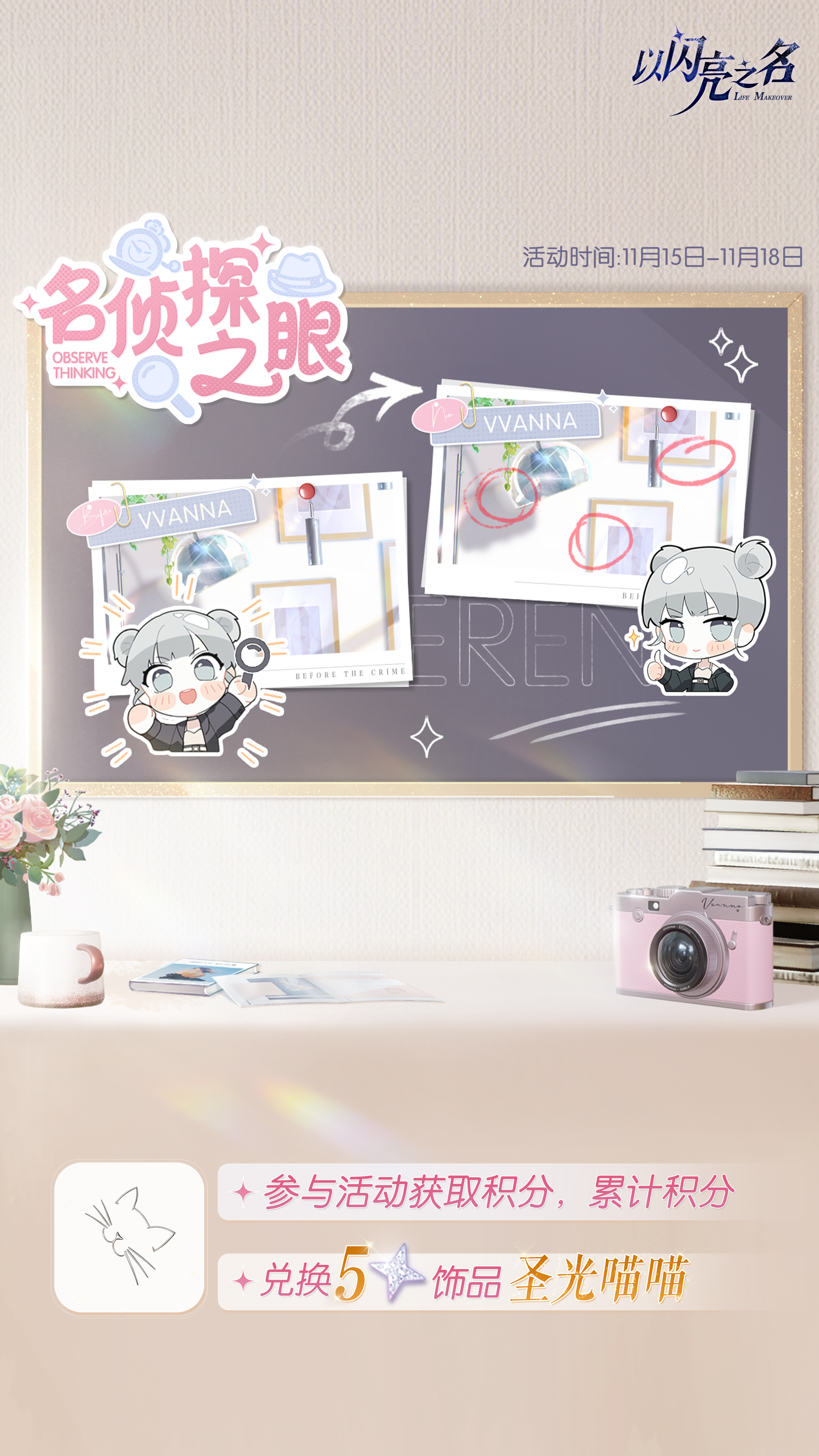 累积侦探积分,可以获取五星饰品【圣光喵喵】、拍照萌拍【灵感爆发】、钻石*30、潮流色卡*9及多种材料道具奖励!